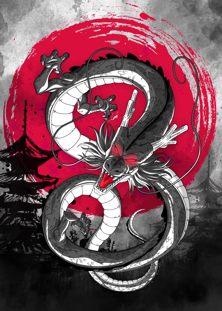 The image features Shenron from Dragon Ball, a serpentine dragon with a black and white body and red eyes and tongue.