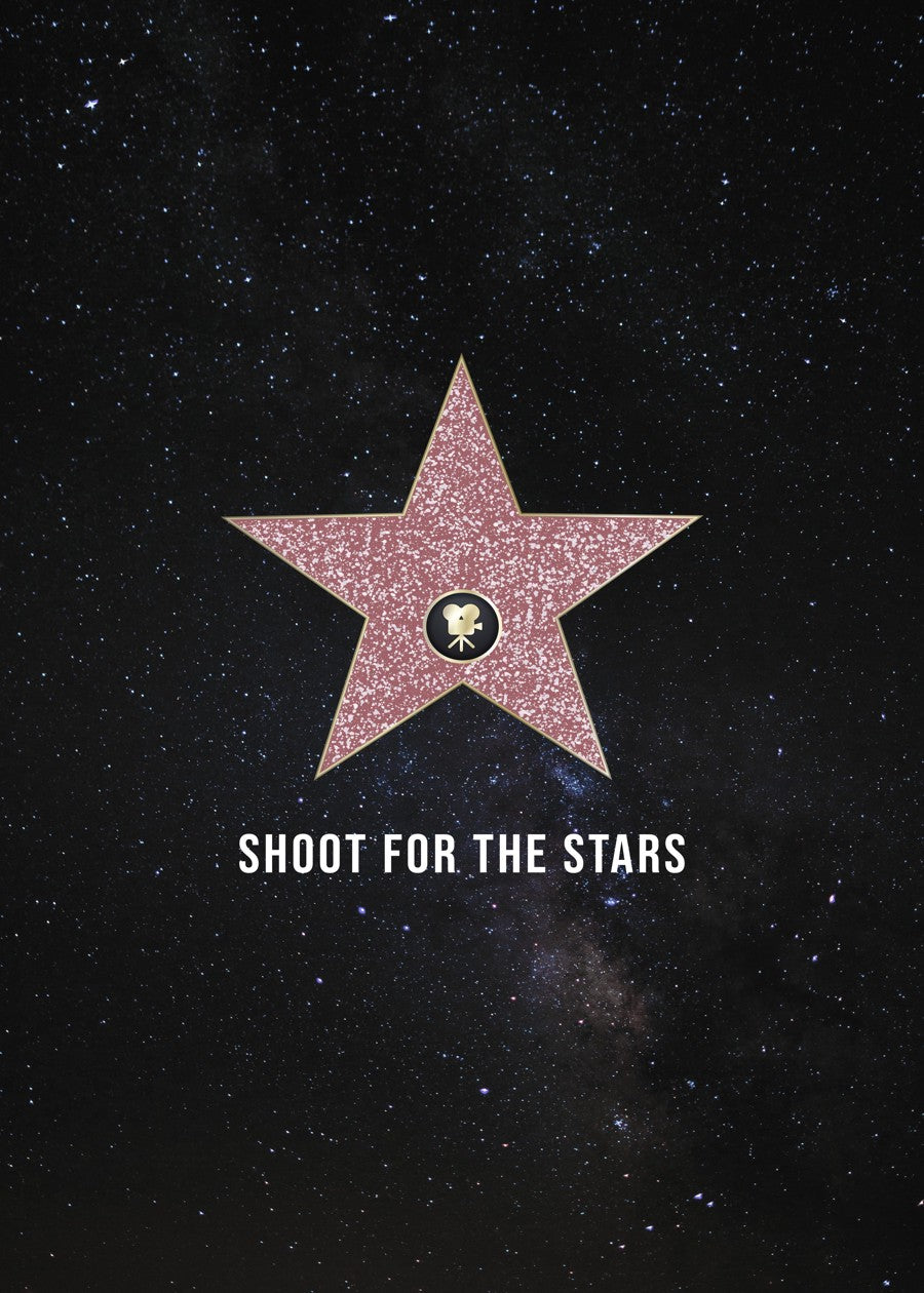 Inspiring art print featuring a glittery Hollywood Walk of Fame star against a cosmic starry sky background, encouraging ambition.