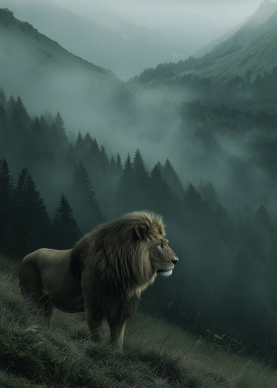 A majestic lion stands on a misty, grass-covered hillside, overlooking a dark, atmospheric valley and evergreen forest.
