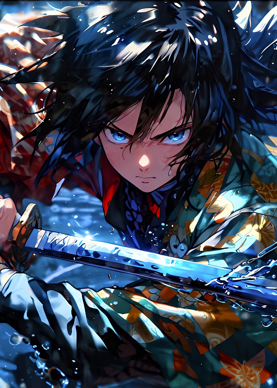 Giyu Tomioka moves like a calm stream—silent, swift, and deadly. The Water Hashira defends humanity with quiet strength.