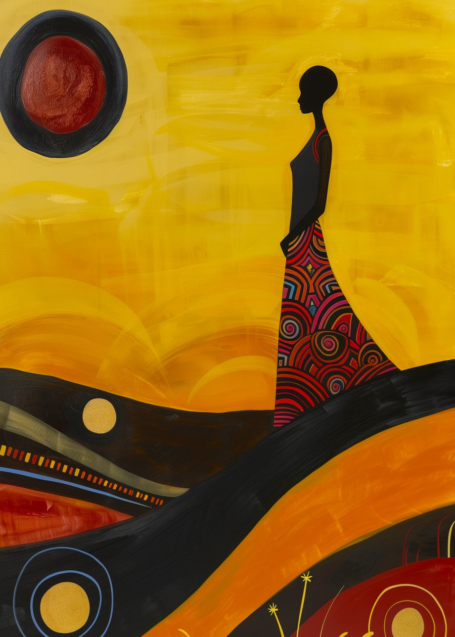 A graceful silhouette walking through vivid tribal-inspired patterns and abstract sunset hues—modern and cultural fusion.