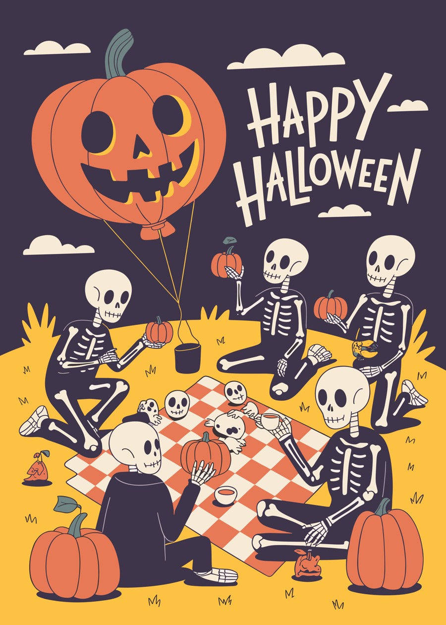 Skeletons gather for a Halloween picnic on a checkered blanket in a pumpkin field, with a large jack-o’-lantern balloon and festive pumpkins.