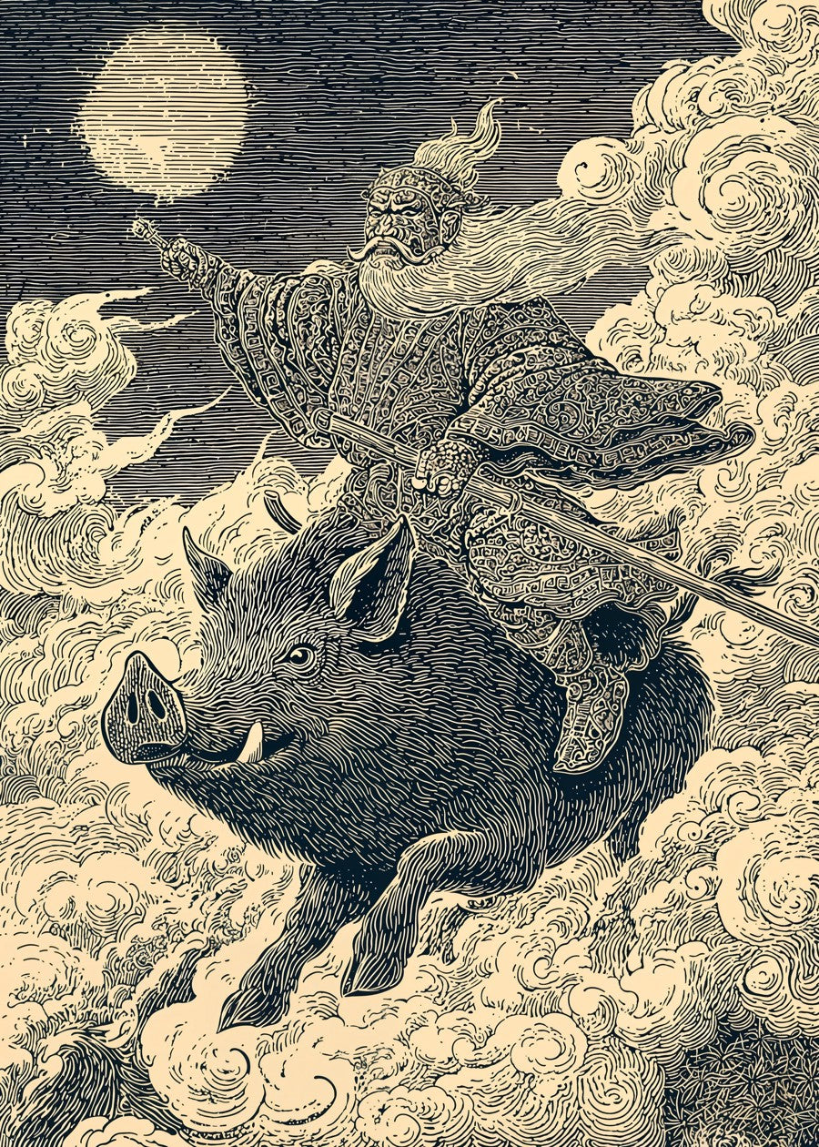 A legendary warrior rides a flying boar across celestial skies. A bold tribute to ancient myths in Japanese ink style.