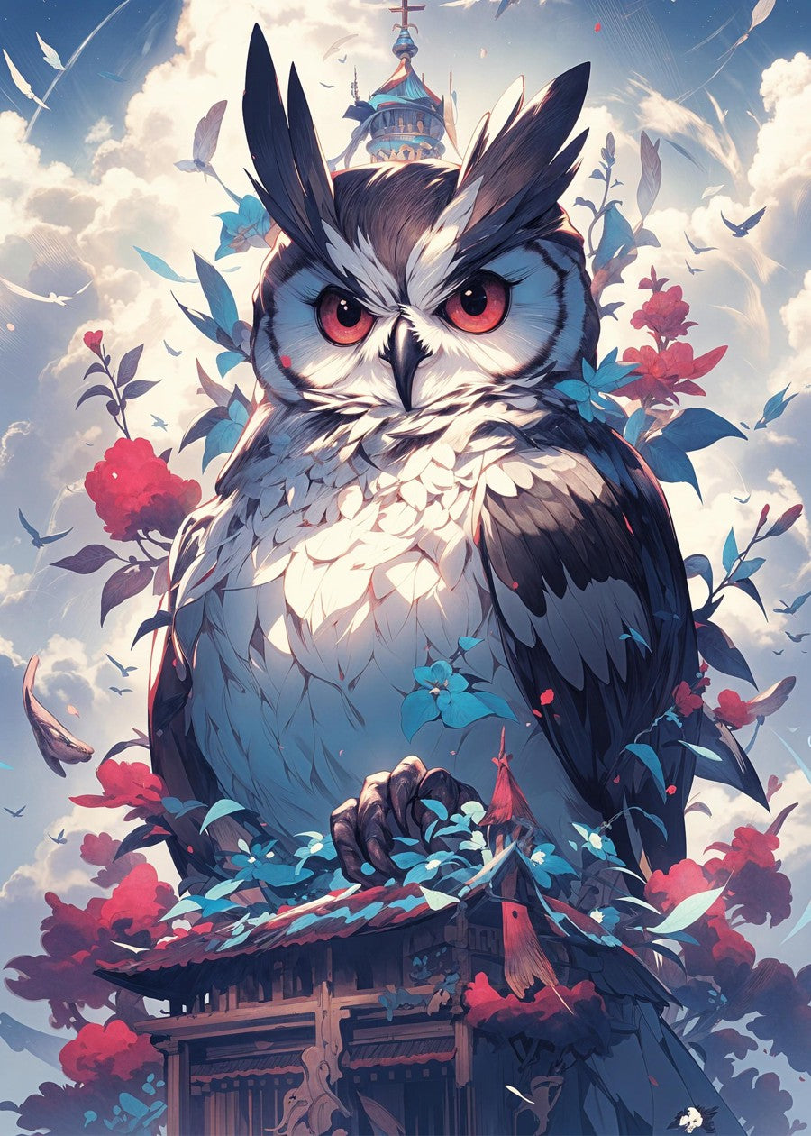 A watchful owl towers above a temple, feathers swirling in floral magic—guardian of skies and spirit.