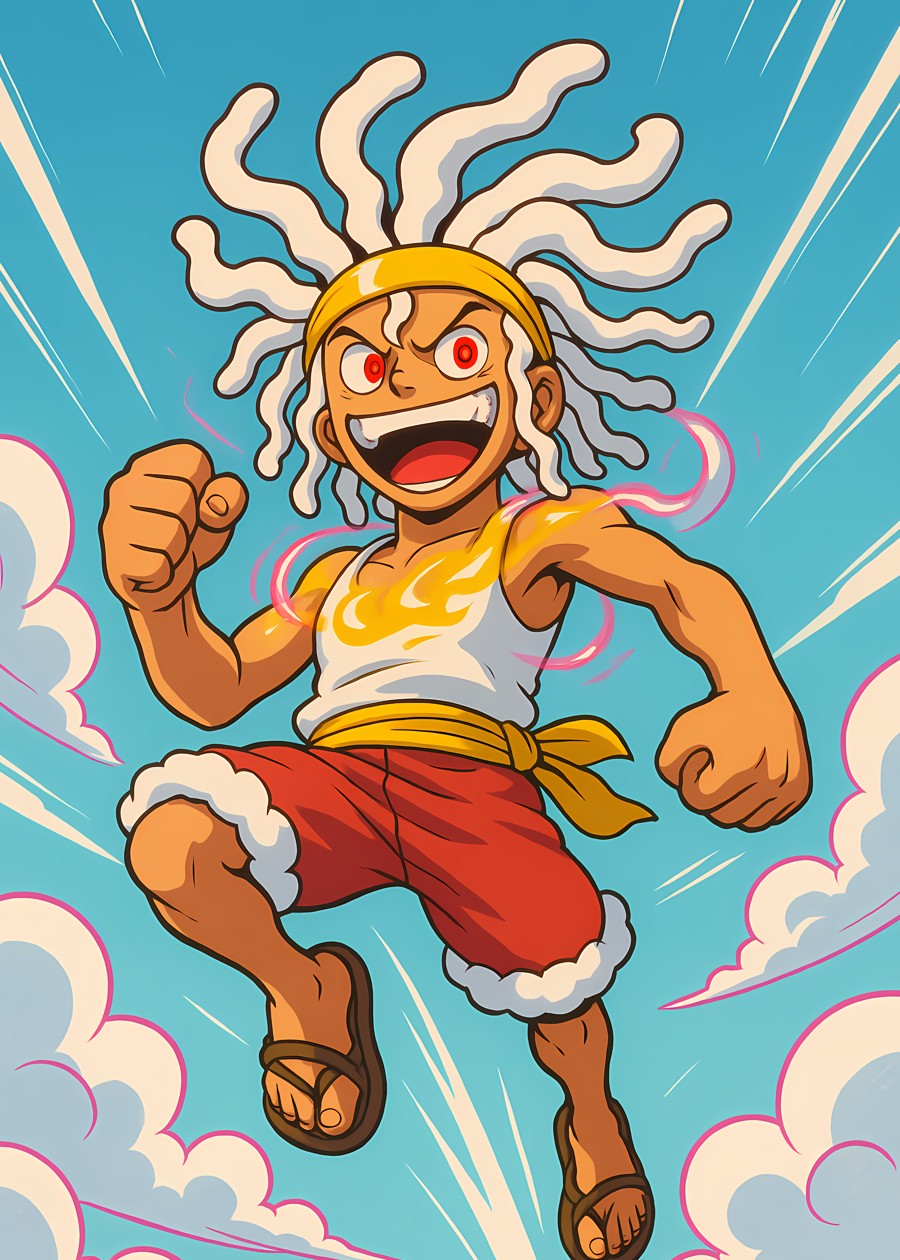 Gear 5 Luffy leaps through the sky with radiant energy — a vibrant, cartoon-god celebration of freedom and joy.