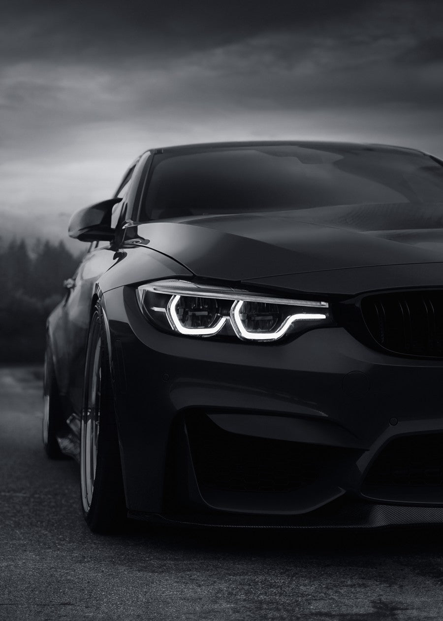 A black and white close-up shot of a sleek BMW M4 with its headlights on, capturing its aggressive front design.