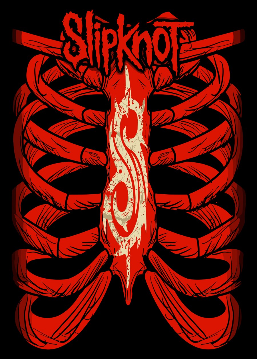 A bold and intense design representing Slipknot, featuring a stylized ribcage in vivid red hues emblazoned with the band’s distinctive “S”.