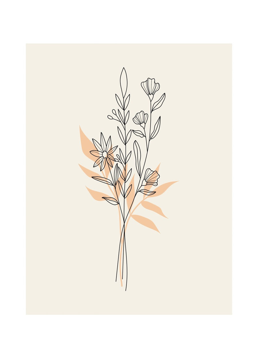 A delicate minimalist floral artwork featuring fine black line drawings of wildflowers layered over soft peach abstract shapes.