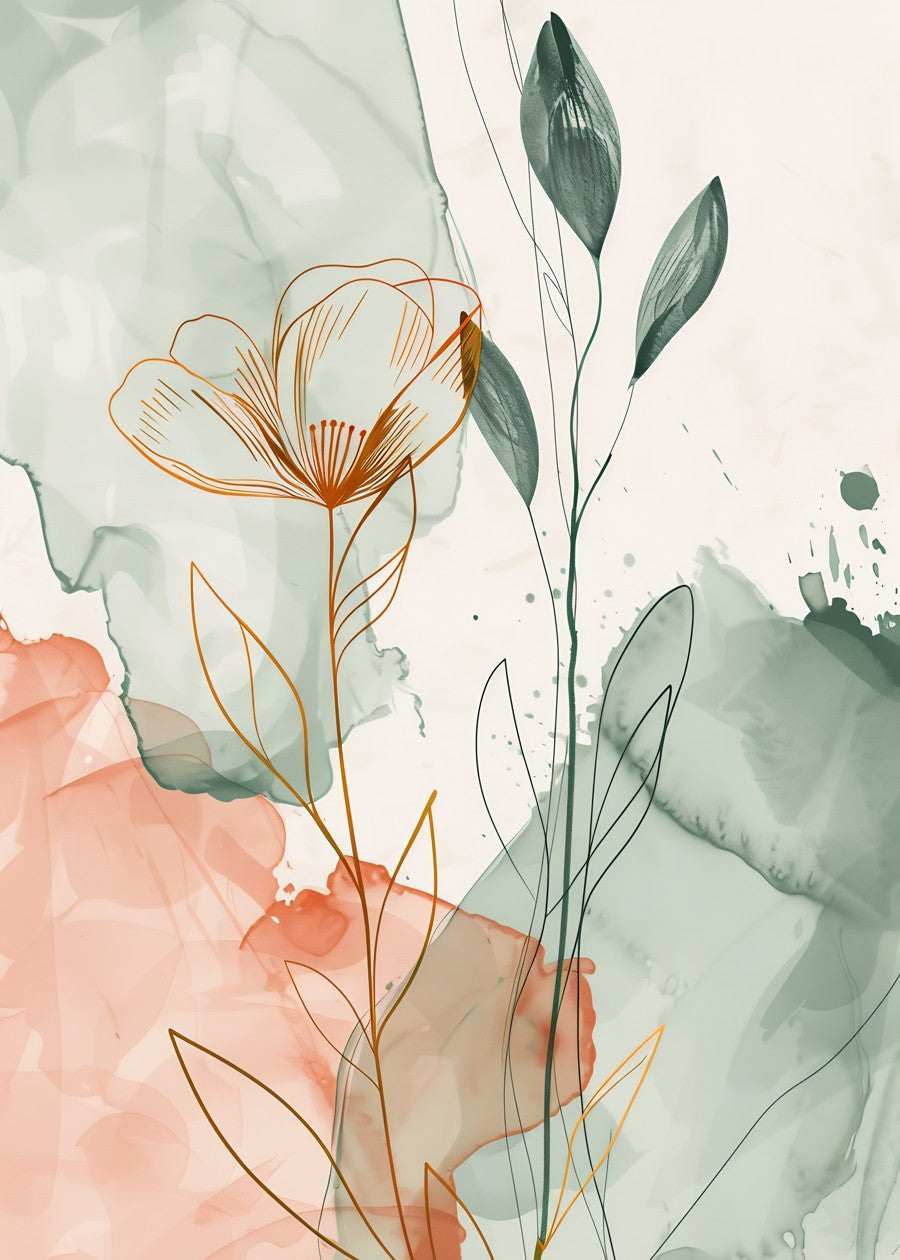 Delicate line flowers layered over green and coral watercolor textures in calming tones.