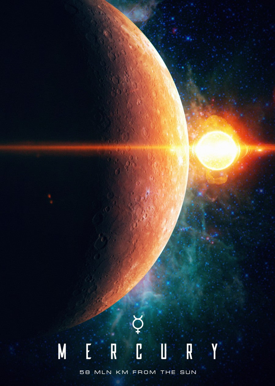 Mercury with the blazing sun, showcasing its cratered surface against a stellar backdrop. The closest planet, 58 million km from the sun.