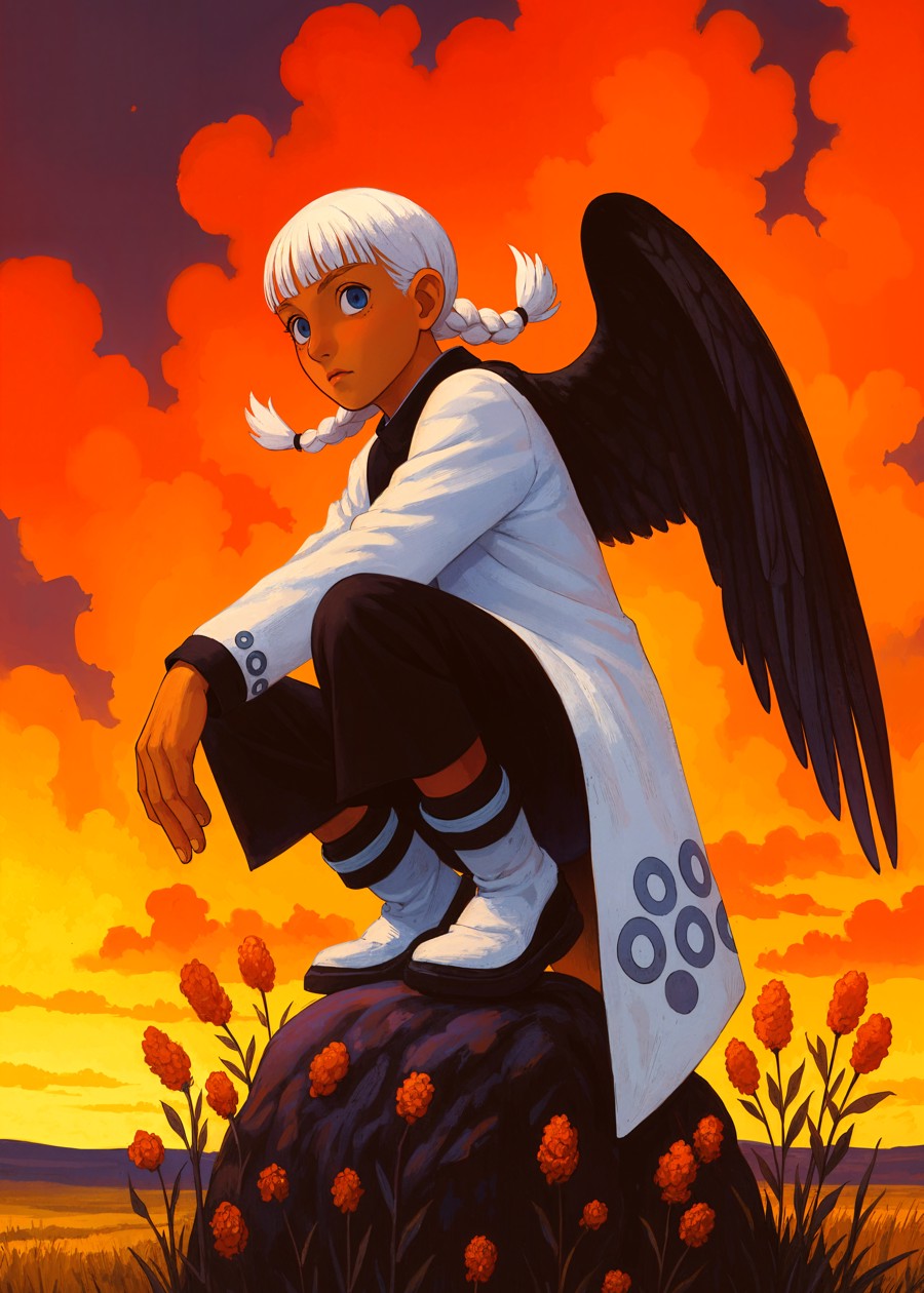 A mysterious figure with jet-black wings sits calmly beneath a blazing, surreal sky.
