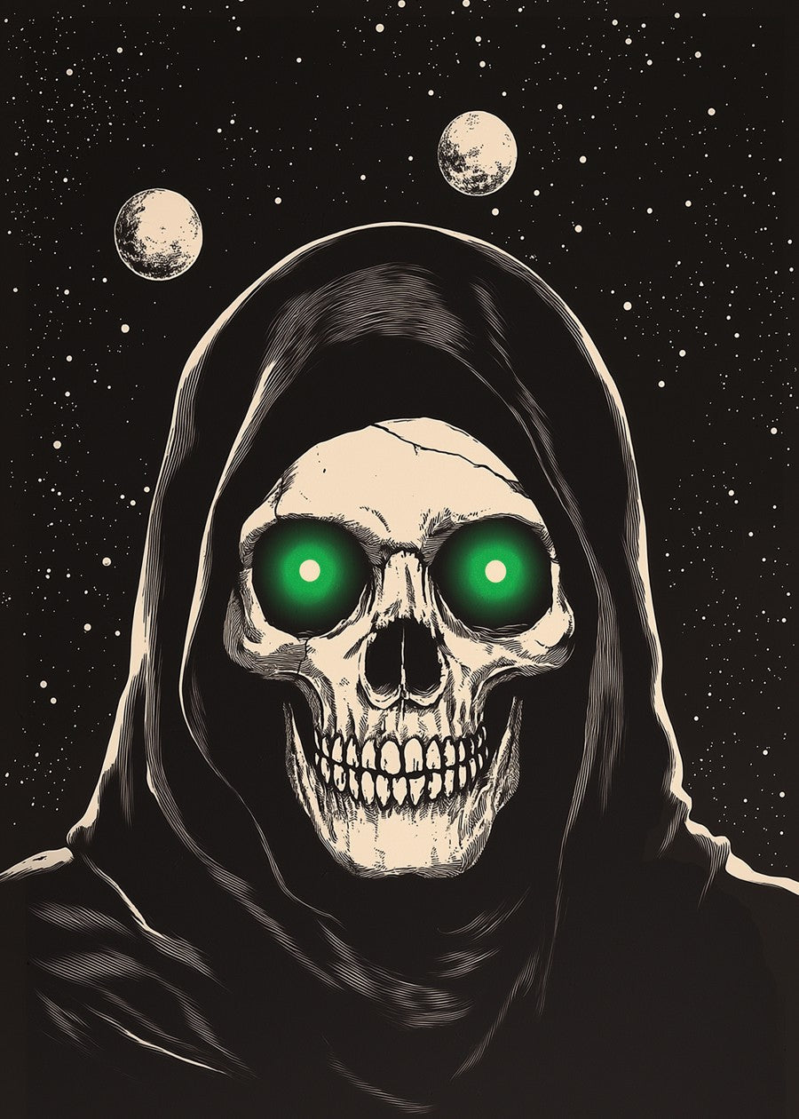 A dramatic black and white illustration of a hooded skull with intense, glowing green eyes under a dark, starry sky with moons.
