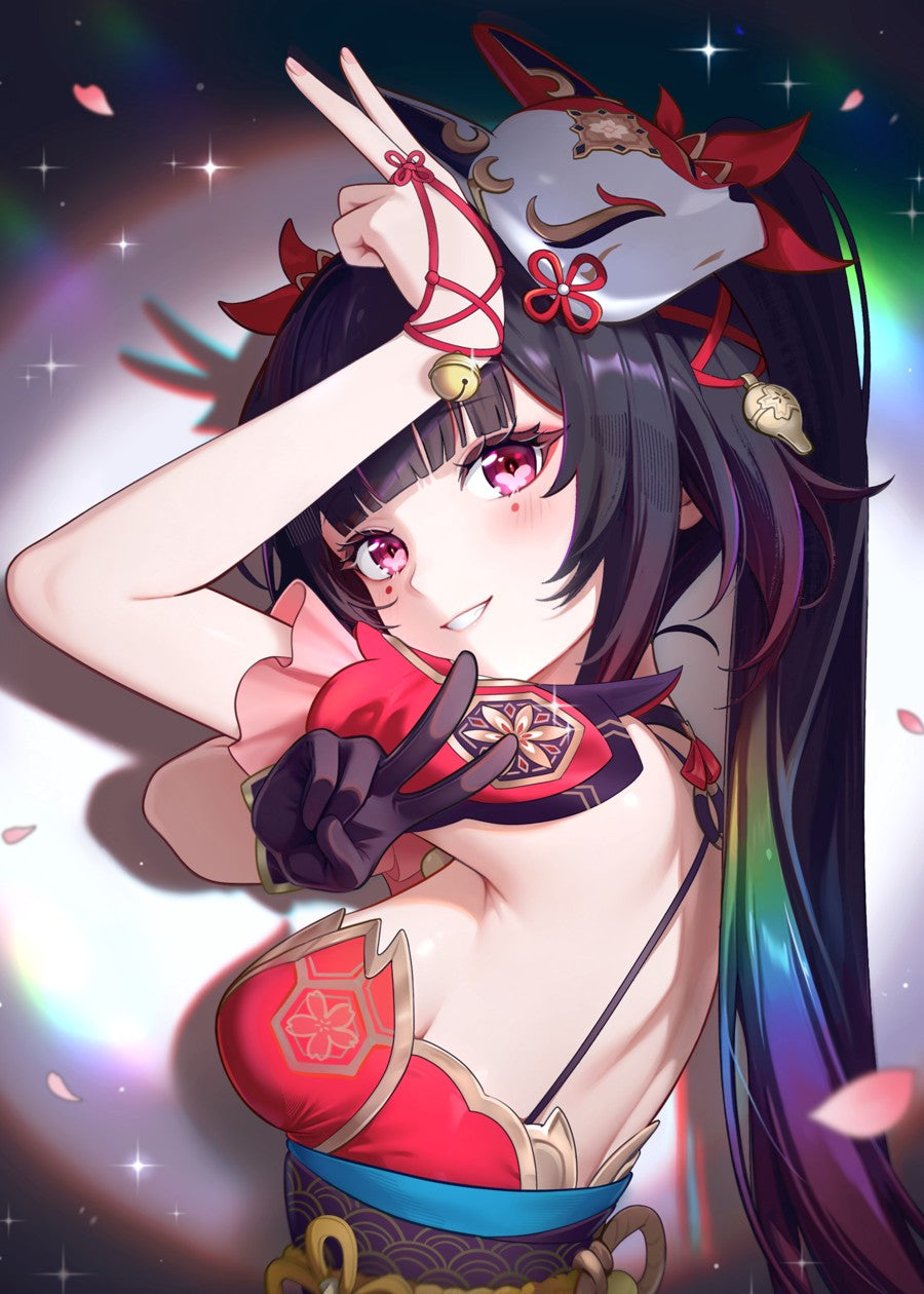 Anime girl with long black hair, a fox mask on her head, and a red outfit, striking a pose.