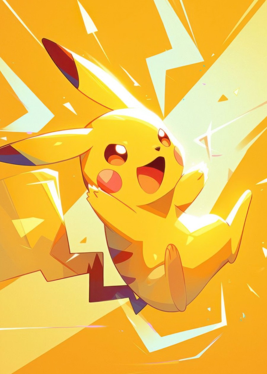 Pikachu celebrating with vibrant sparkles of yellow electric energy.