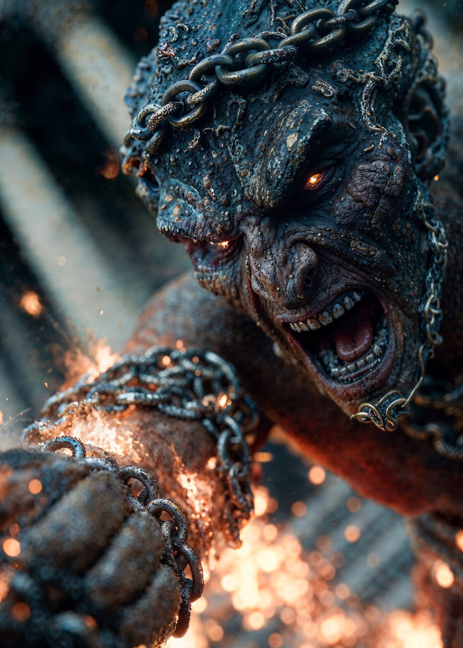 Battle-scarred Spartan demigod lashes flaming chain blades in a ruined temple above molten rock—explosive mythic power.