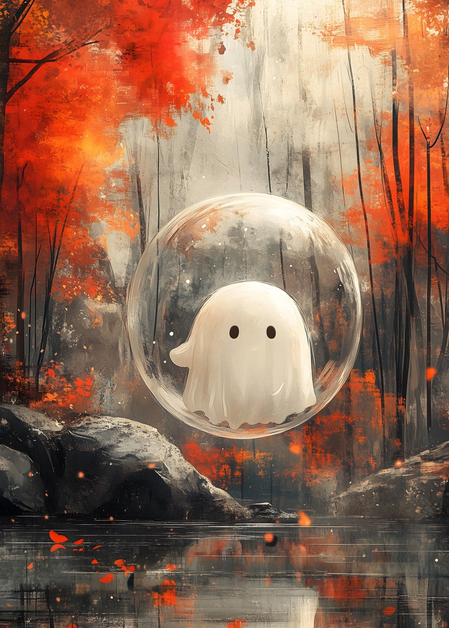A playful spirit floats serenely in a mystical autumn forest, encased in a magical bubble.