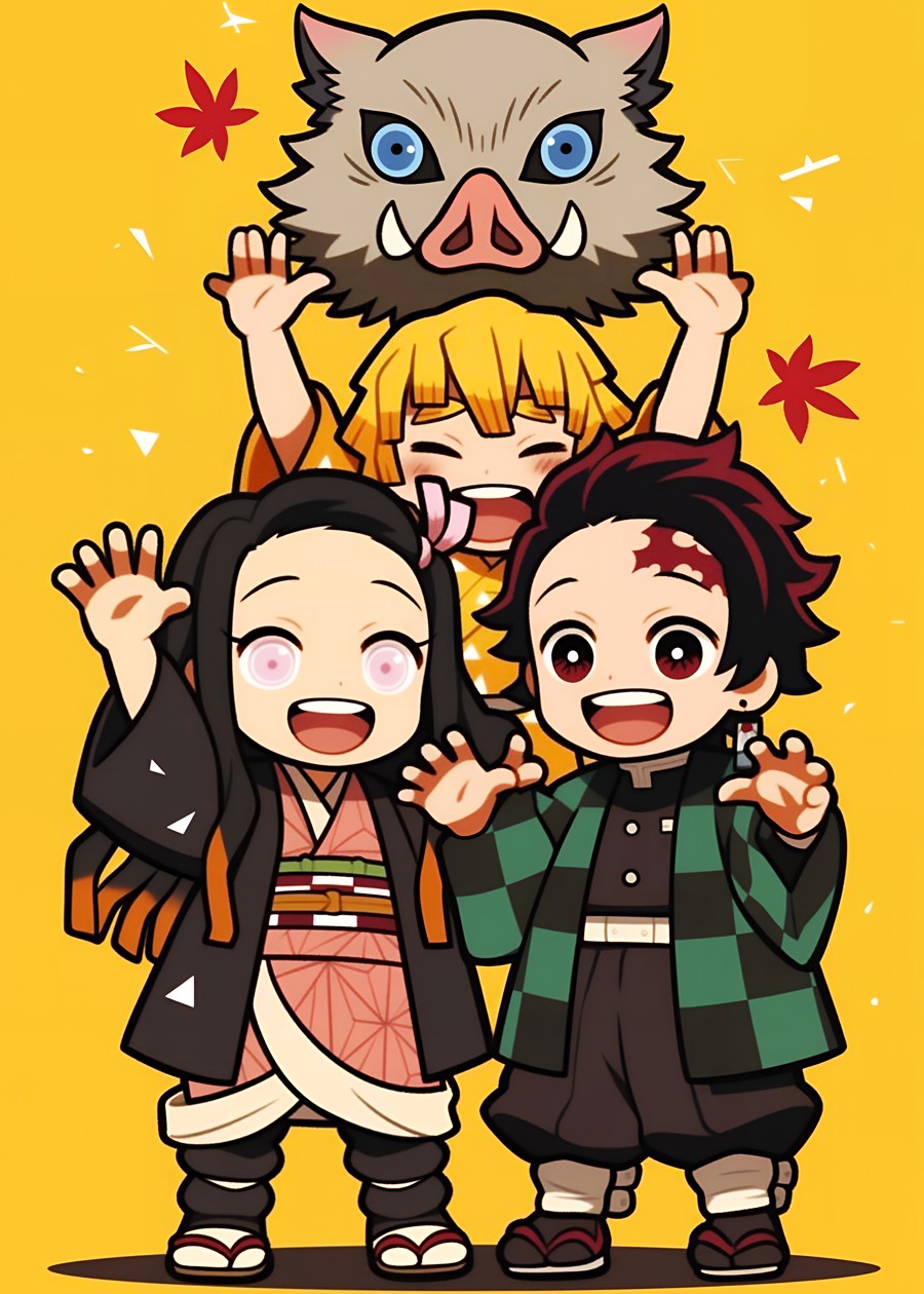 Tanjiro, Nezuko, Zenitsu, and Inosuke form a playful stack on a yellow backdrop with red stars, all smiling and waving with joy.