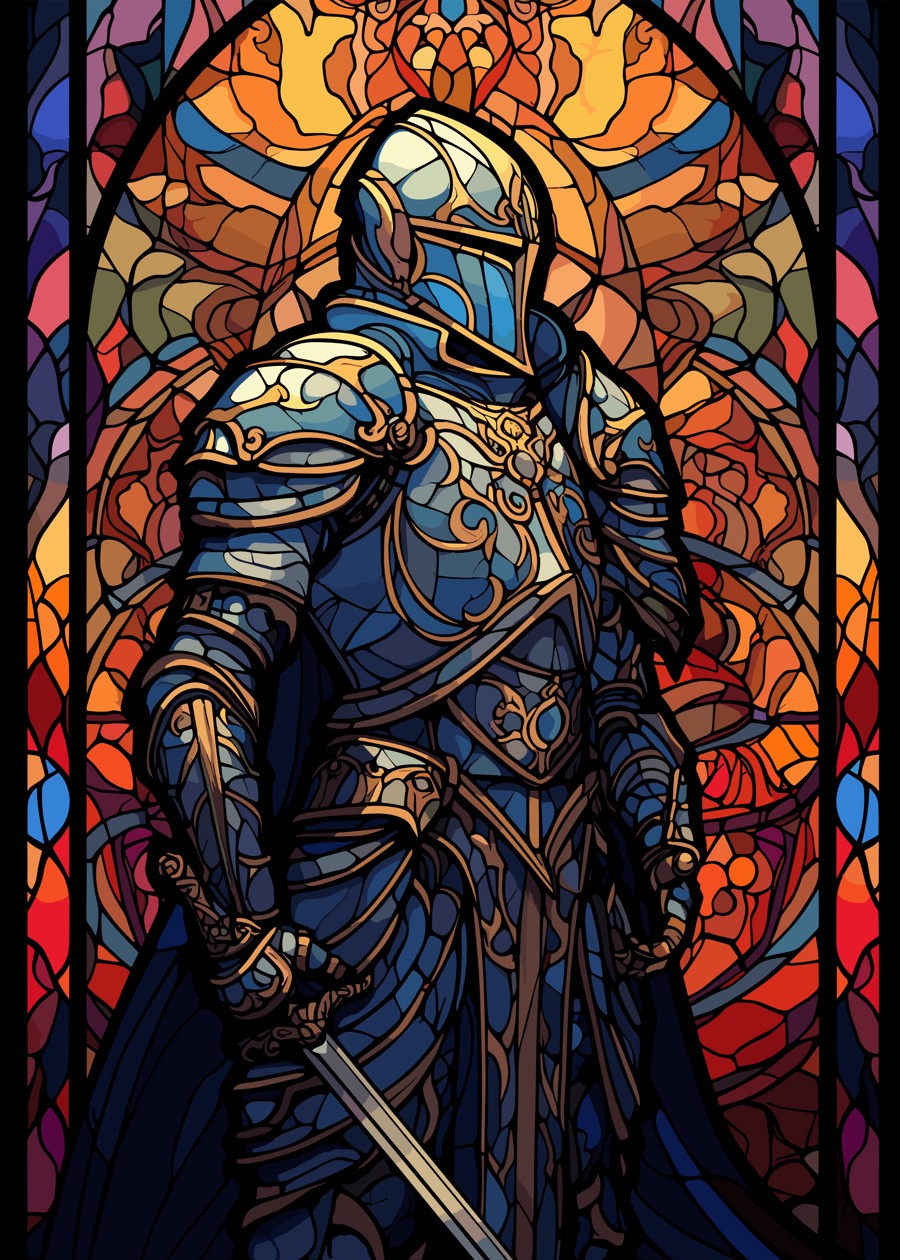 Noble blue knight in detailed stained glass style, framed by vibrant warm-toned patterns. A regal fantasy warrior scene.