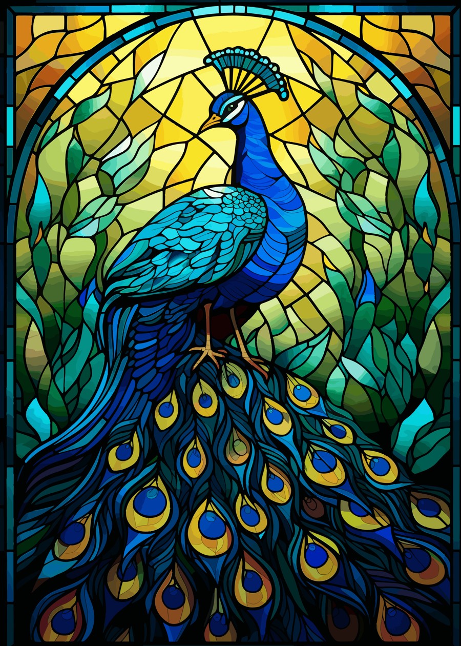 Elegant peacock in rich blues and greens, captured in luminous stained glass with vivid tail feathers and golden background.