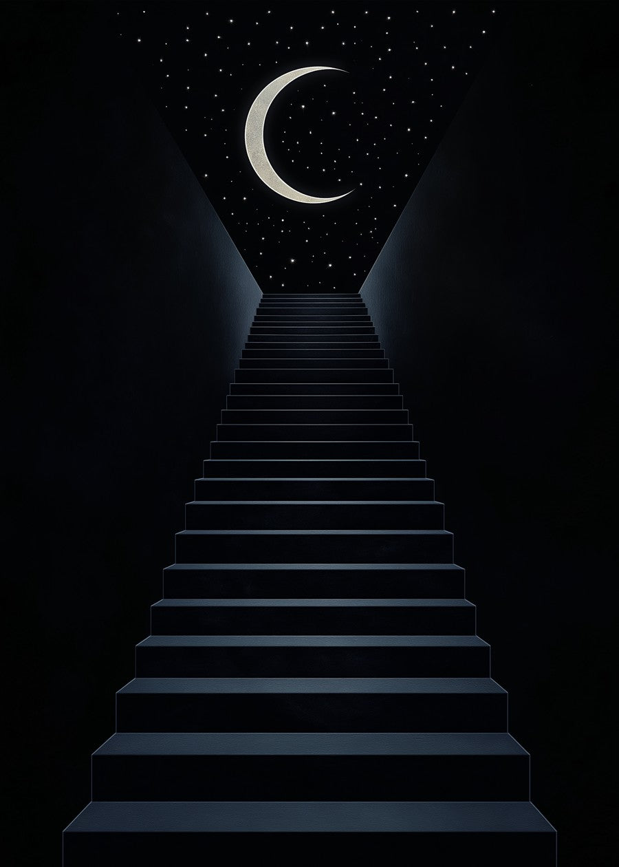 A long, dark staircase leading up toward a brilliant crescent moon and a ceiling of sparkling stars. A simple, striking path to the cosmos.