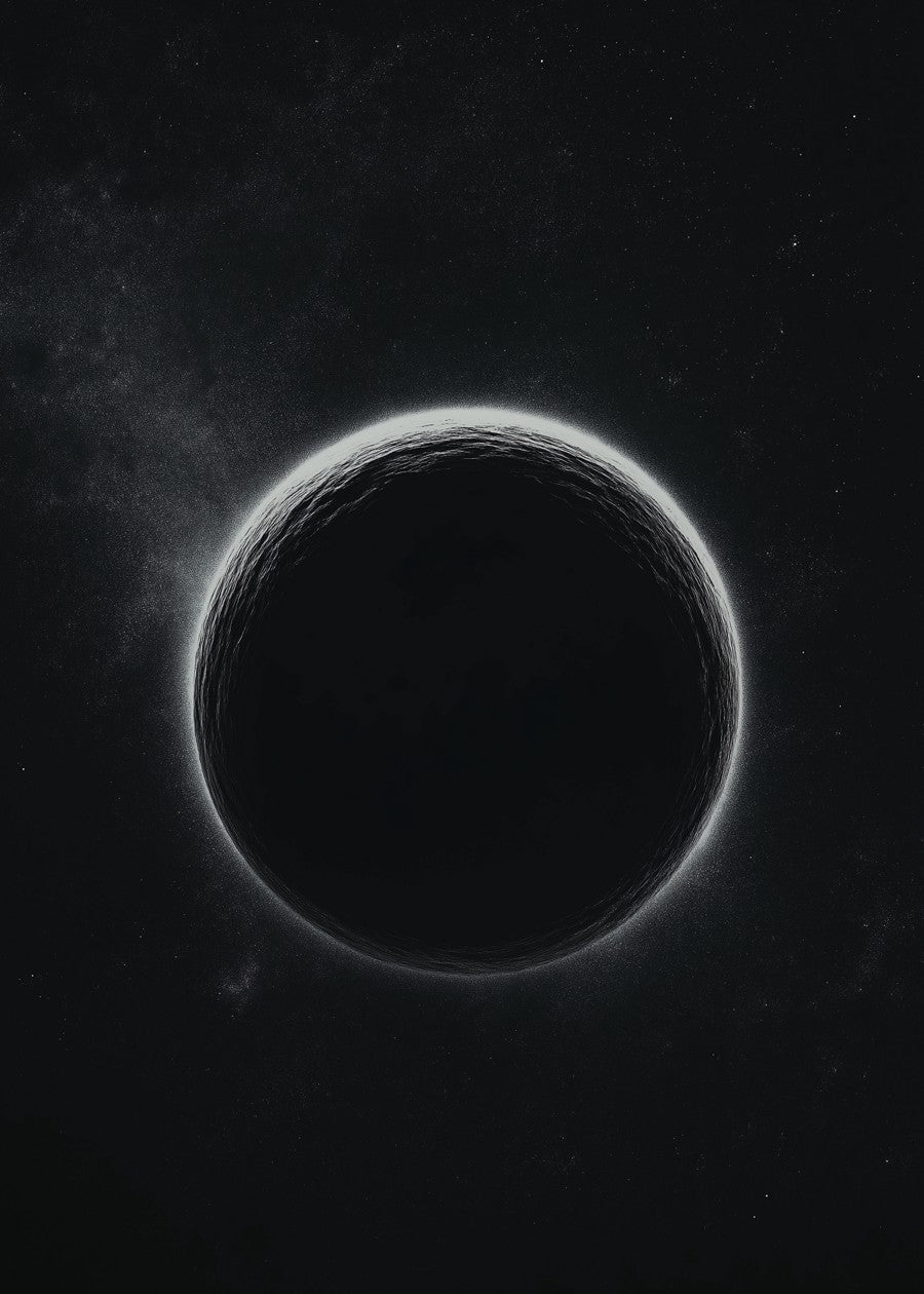 A mesmerizing, stark black orb with a textured surface, ringed by a white glow against a deep black, star-filled space. Extreme contrast.
