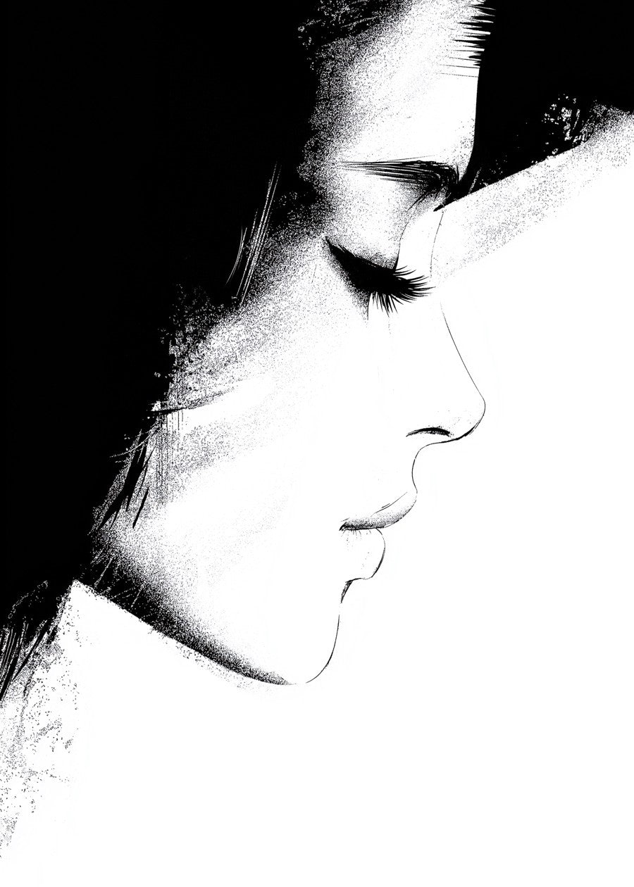 A dramatic, high-contrast black and white sketch of a woman's profile, defined by delicate line work and heavy, moody shadow.