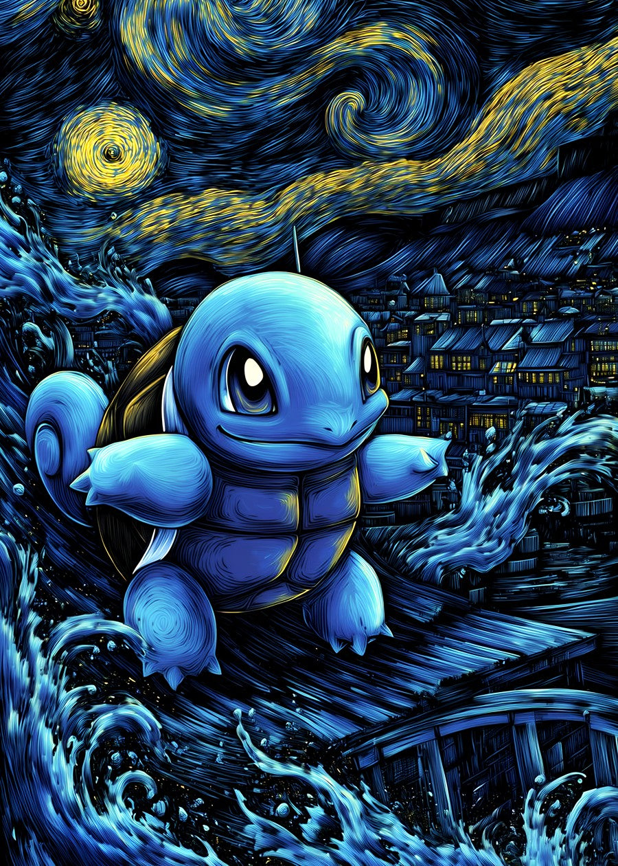 Squirtle shines in Van Gogh’s Starry Night style, surrounded by swirling skies, glowing moonlight, and vivid blue waters.