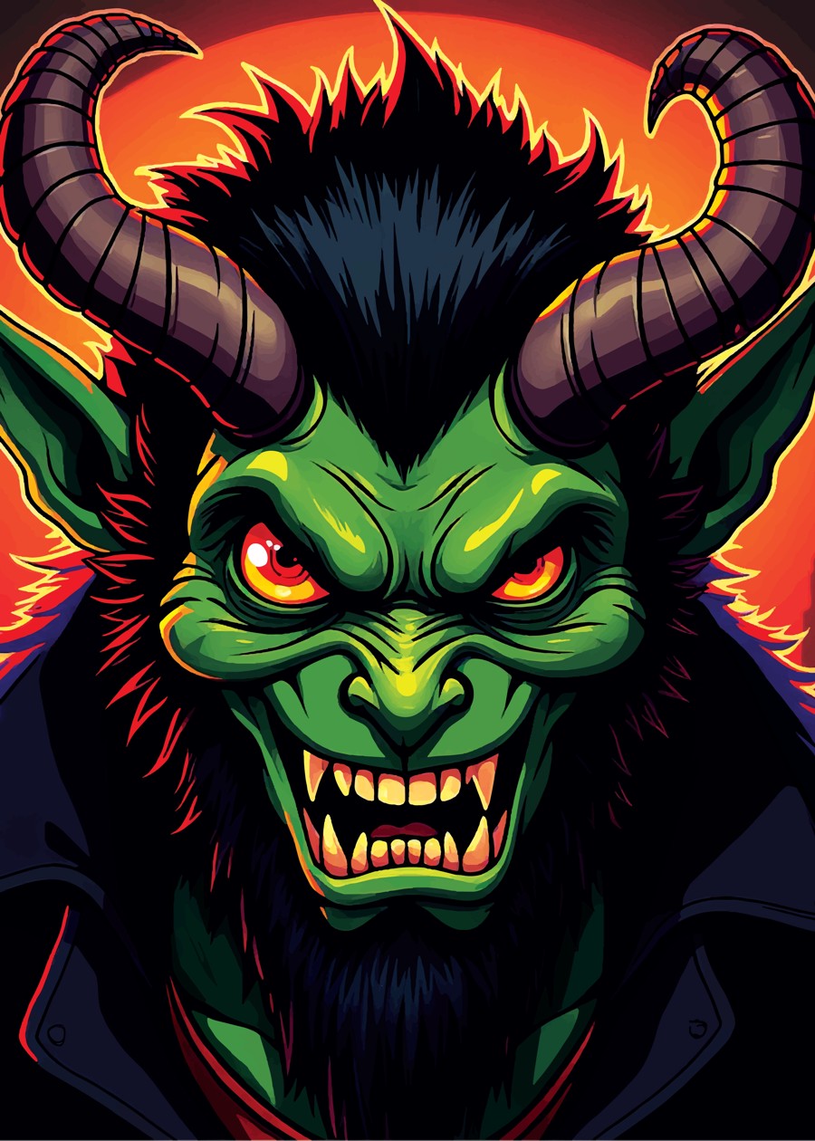 A monster with two horns in green face colour