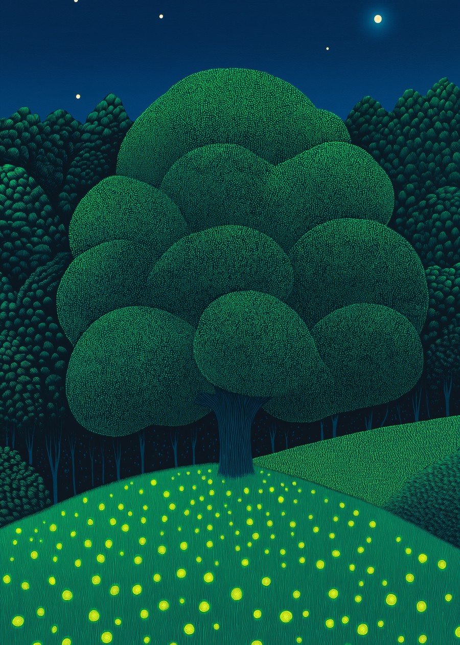 A large, textured tree stands above a field sparkling with yellow lights, surrounded by a dense forest under a dark, starry night sky.