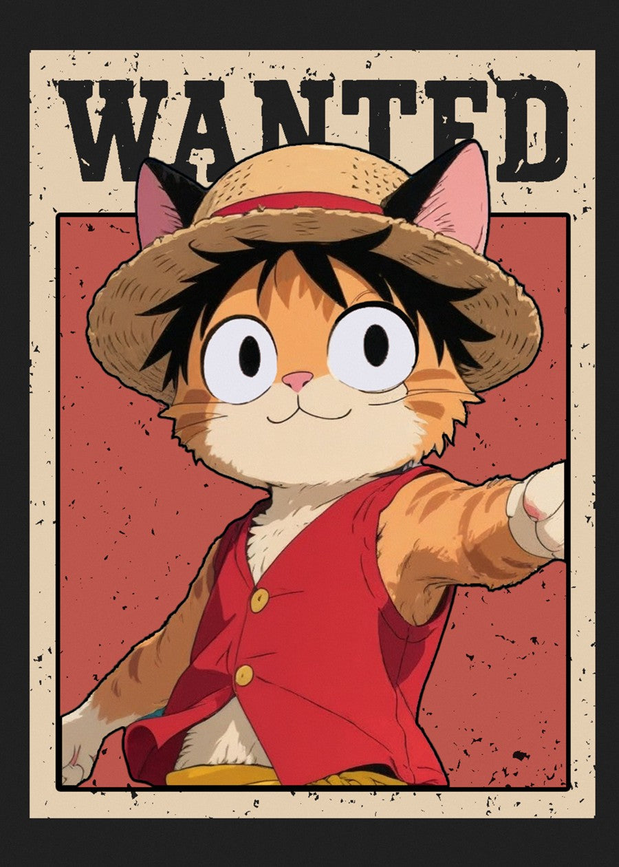 A cute cat with a straw hat and red vest, looking like a wanted poster for the beloved anime character Luffy.