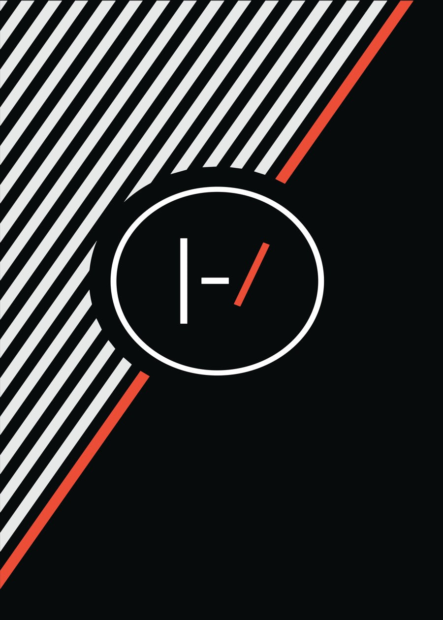 A minimalist design featuring the classic Twenty One Pilots logo, set within a circle and placed against diagonally striped white, black.