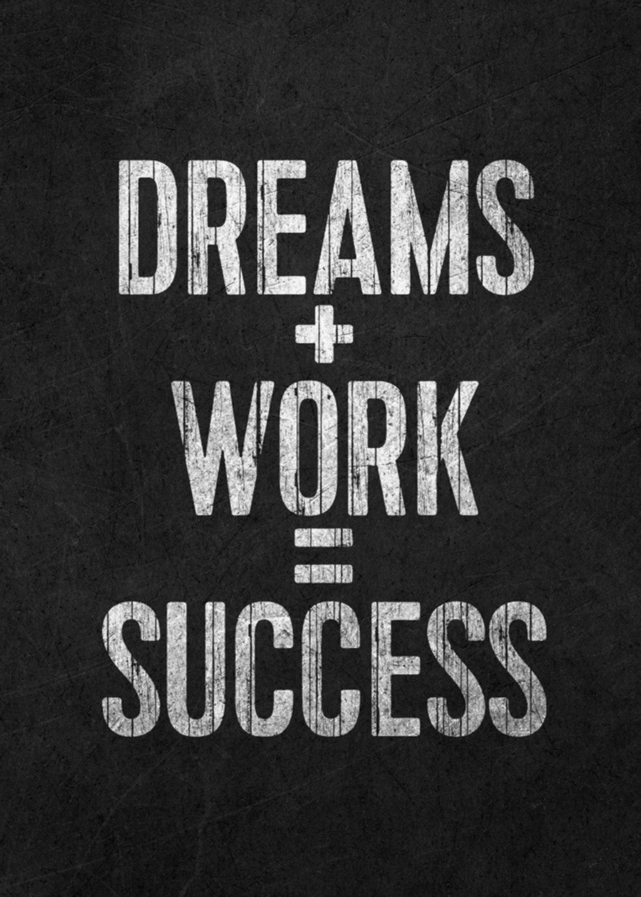 DREAMS + WORK = SUCCESS. A simple, compelling equation on a chalkboard-like background.
