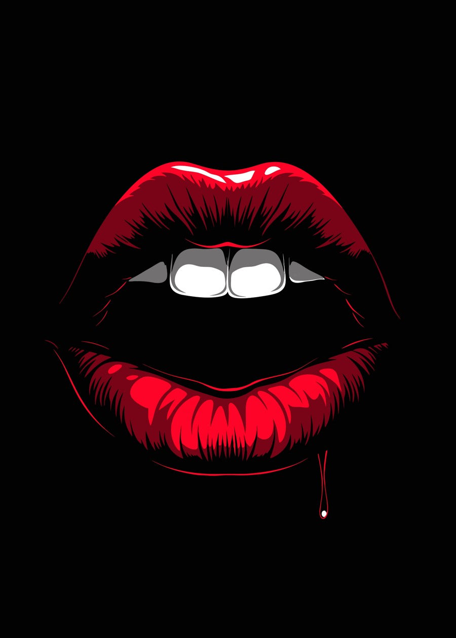 Sultry, bright red lips contrasting against a dark background, with white teeth exposed and a single drop of liquid dripping down.