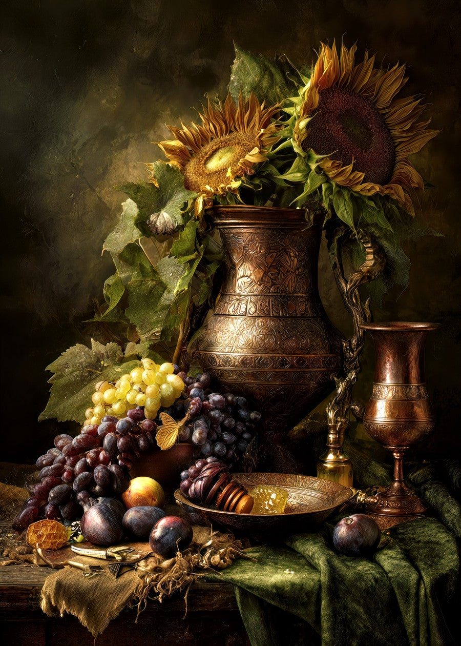 Sunlit Still Life Featuring Sunflowers and Fruits in a Rustic Setting Filled With Warm Autumn Hues