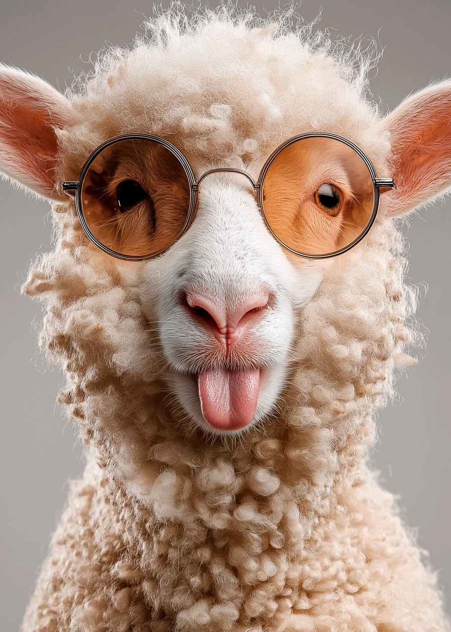 A goofy, fluffy sheep in cool round sunglasses, sticking out its tongue mischievously. It's a hilarious and charming picture of a sheep.