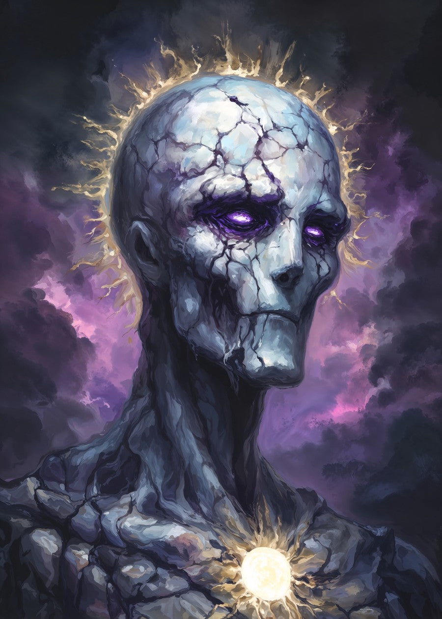 An ancient cosmic guardian, forged in stone and starlight, with a radiant sun blazing from its chest and glowing violet eyes.