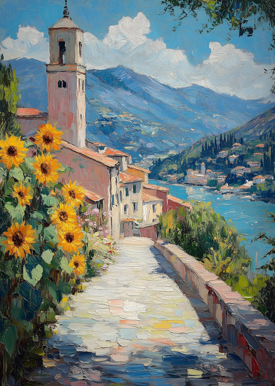Sunflowers adorn a scenic path, leading to a quaint village by the azure lake.
