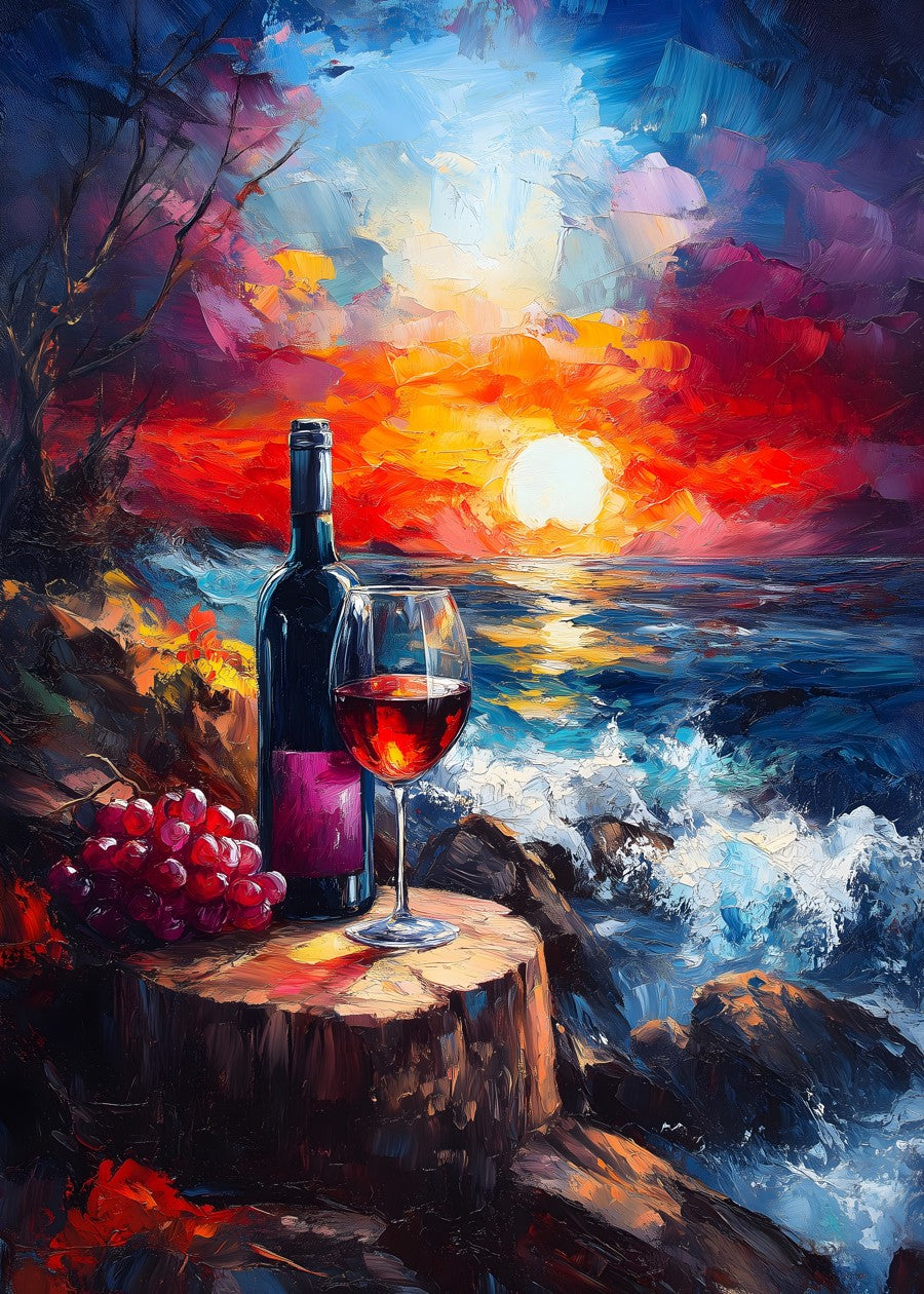 A bottle of wine and glass beside a sunset-lit ocean, casting vibrant colors.