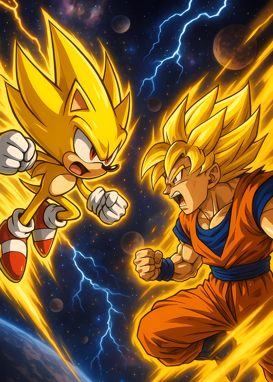 An explosive clash in space! Super Sonic and Goku go head-to-head in a high-energy anime crossover. A must-have for fans of both worlds.