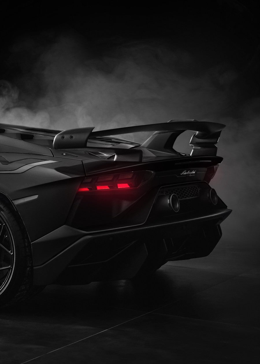 Lamborghini Aventador SVJ in a Smokey Setting: The sleek rear of a black Lamborghini Aventador SVJ emerges from the shadows, its tail lights