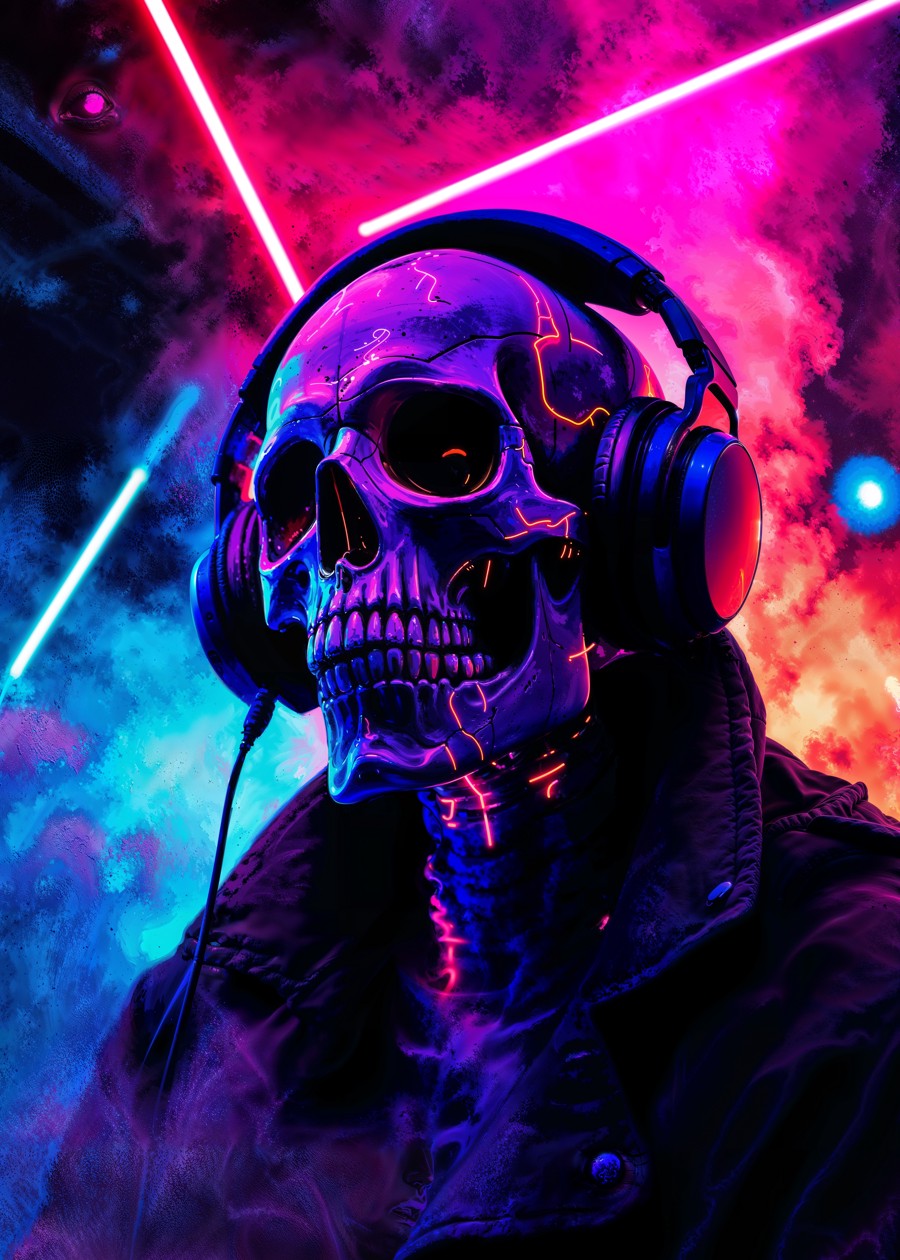 A neon‑lit skull wearing headphones glows with cyber cracks amid smoke and laser lights—retro synthwave club energy and dark vibe.