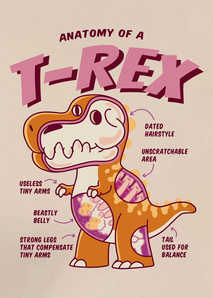 A hilarious cartoon diagram detailing the true internal anatomy of a T-Rex, highlighting its "Useless Tiny Arms" and "Unscratchable Area."