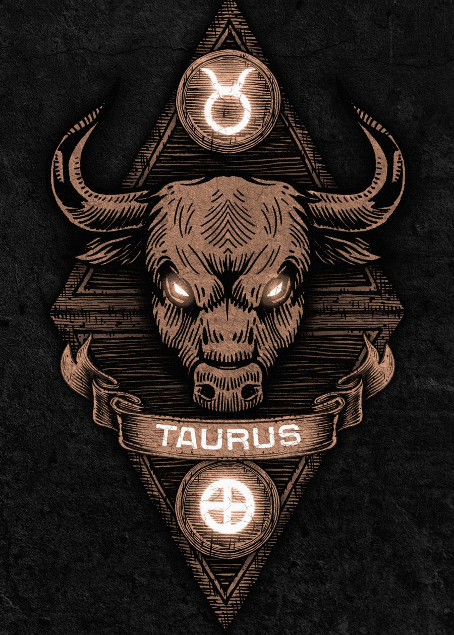 A fierce bull with glowing eyes, emblazoned with the Taurus symbol & earthy element. Strong, grounded zodiac art.