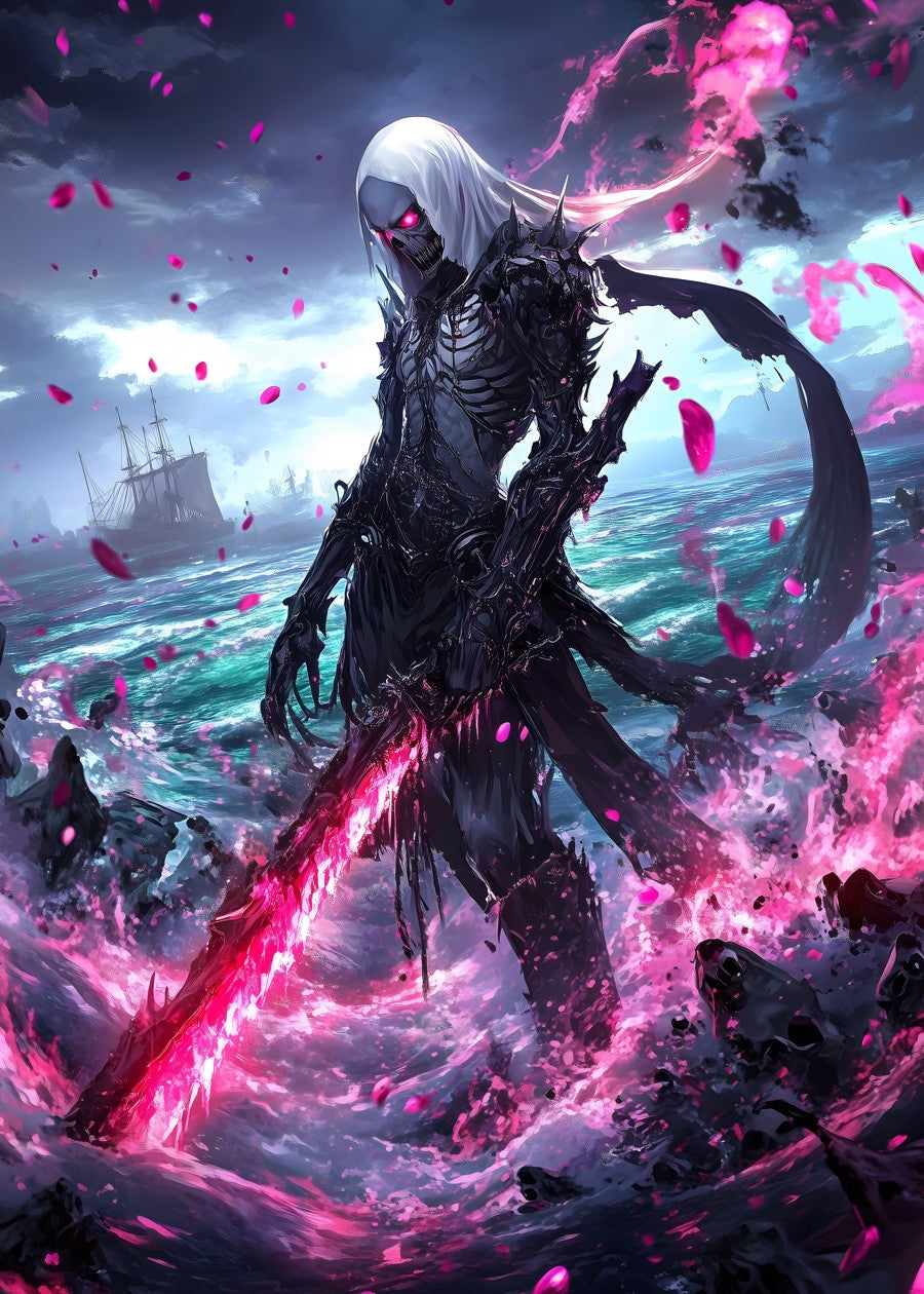 A skeletal warrior emerges from the swirling ocean, wielding a glowing sword.