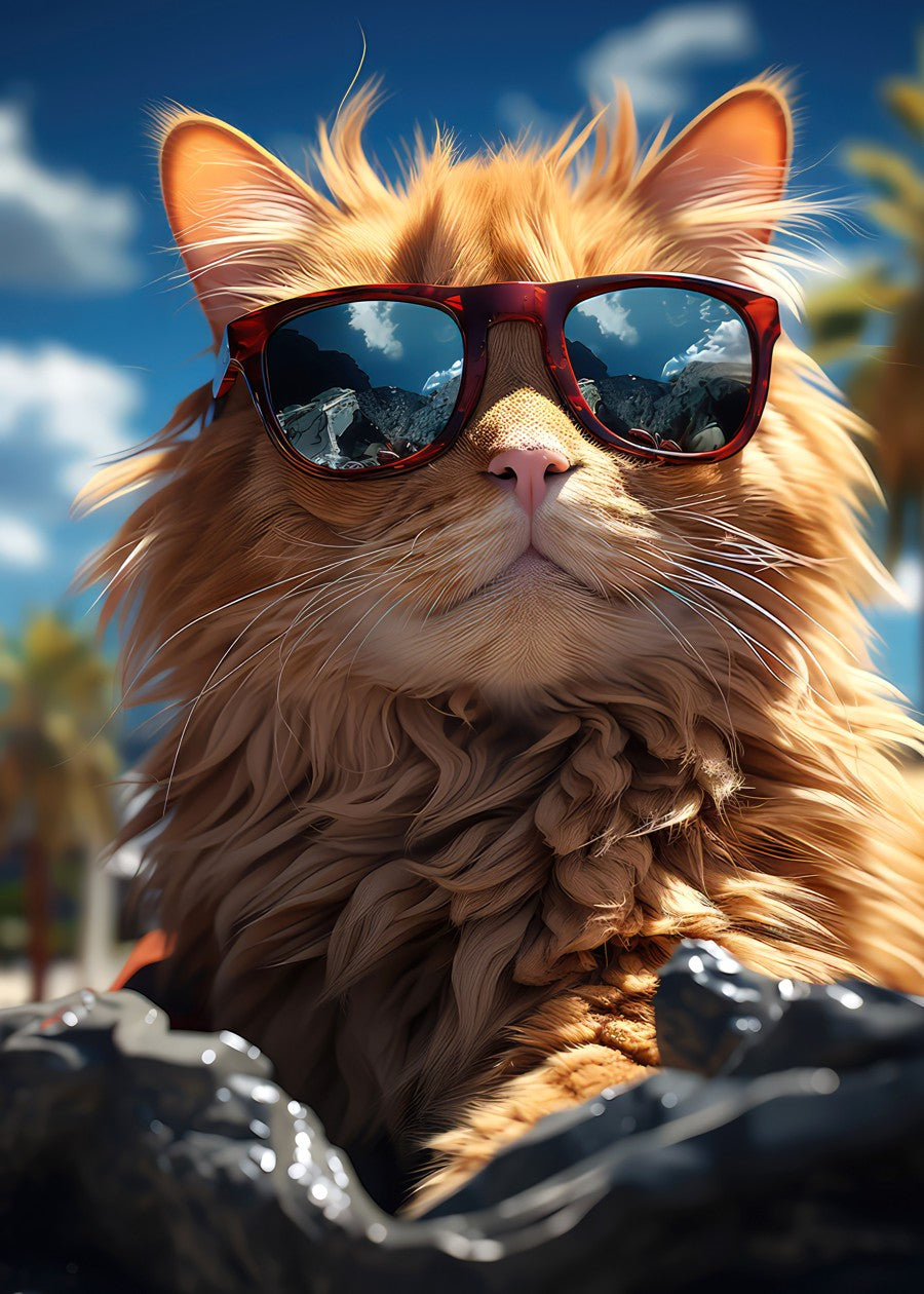 Beach Boss: A cool, fluffy orange cat rocking mirrored shades on a sunny day. Tropical vibes and chill attitude.
