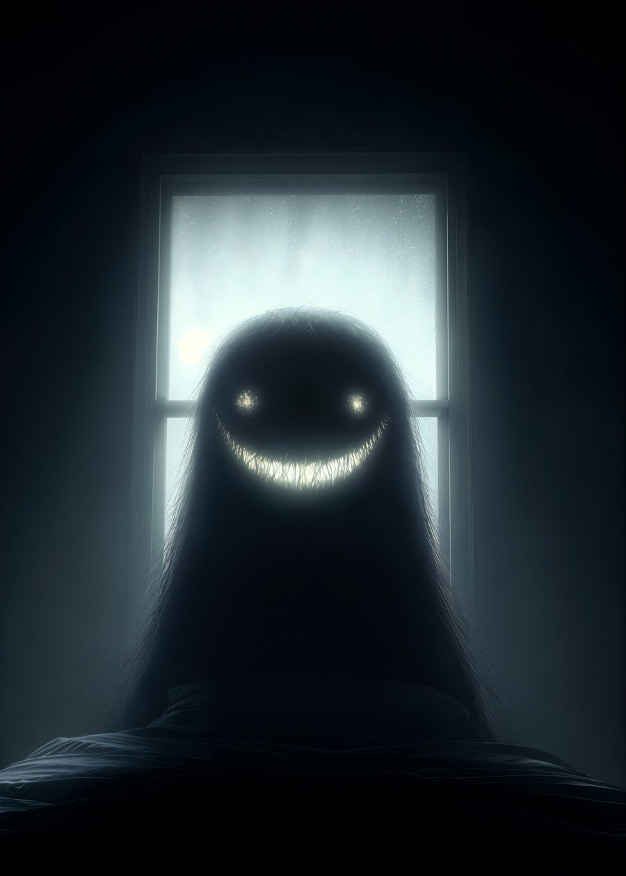 Lurking in the soft glow of moonlight, this sinister presence emerges at the foot of the bed.