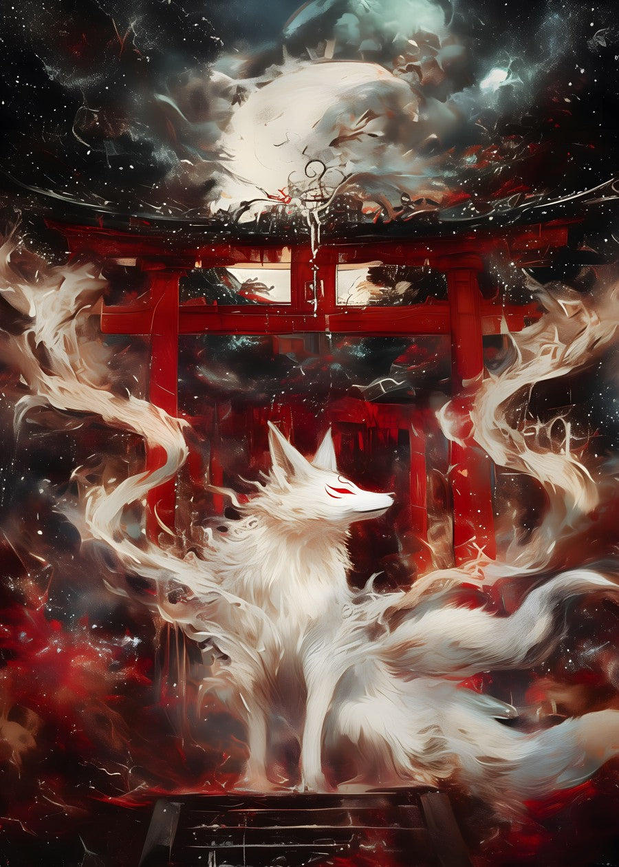 A mystical fox spirit guards the red torii under a swirling cosmic sky.