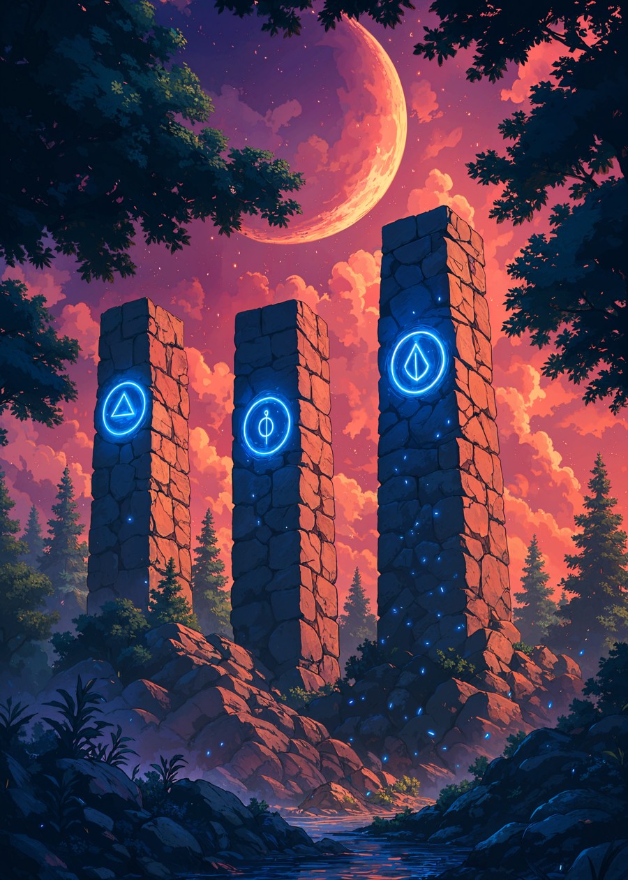 Three ancient stone pillars stand solemnly beneath a glowing crescent moon, each inscribed with glowing blue runes.