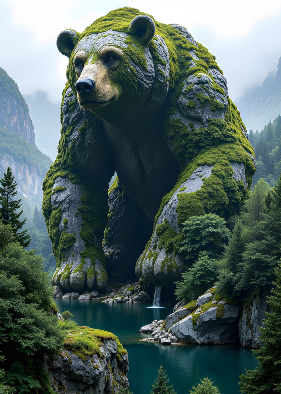 A giant, moss-covered bear emerges majestically in a serene forest landscape.