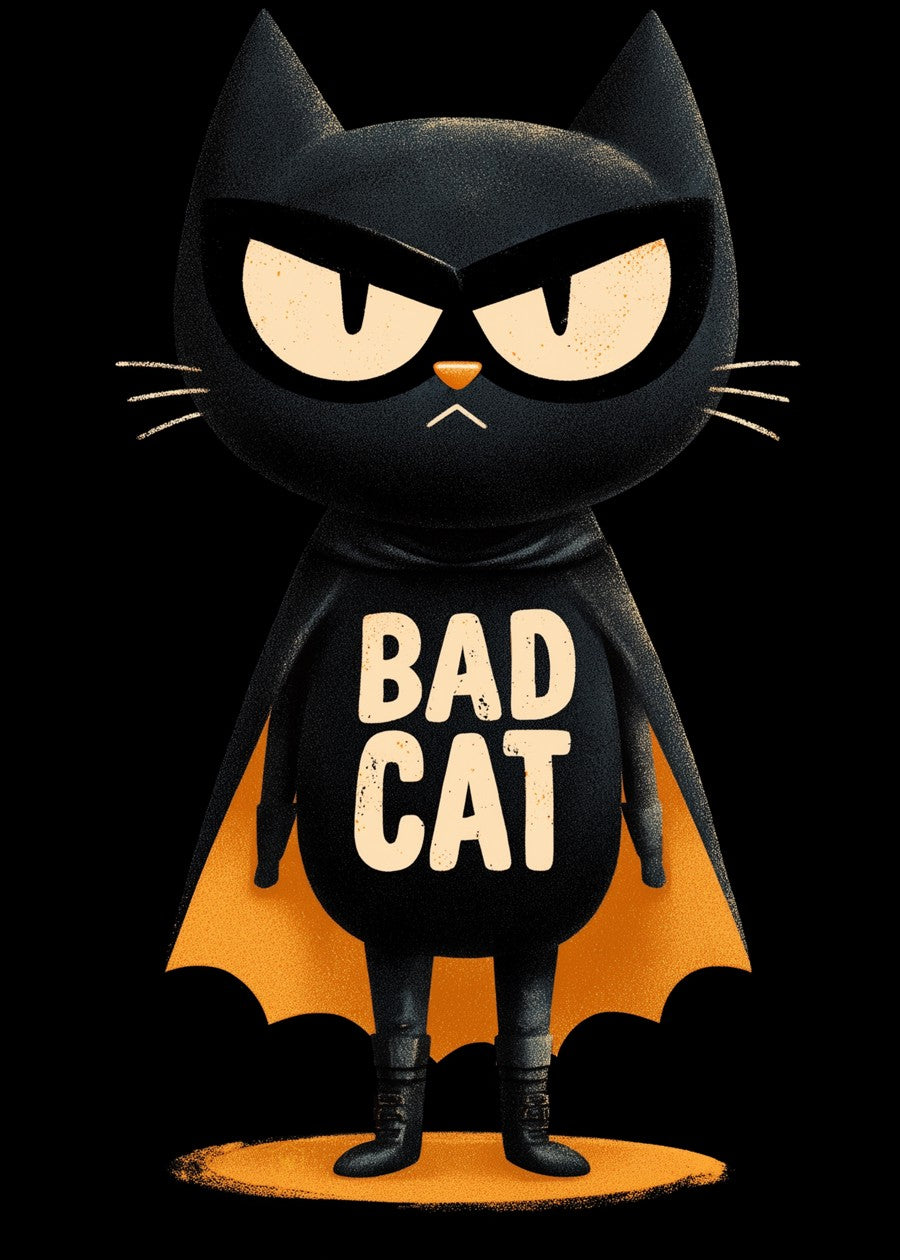 This isn't your average house cat. A serious, black cat stands tall in a cape and boots, proudly declaring its "BAD CAT" status with a scowl.